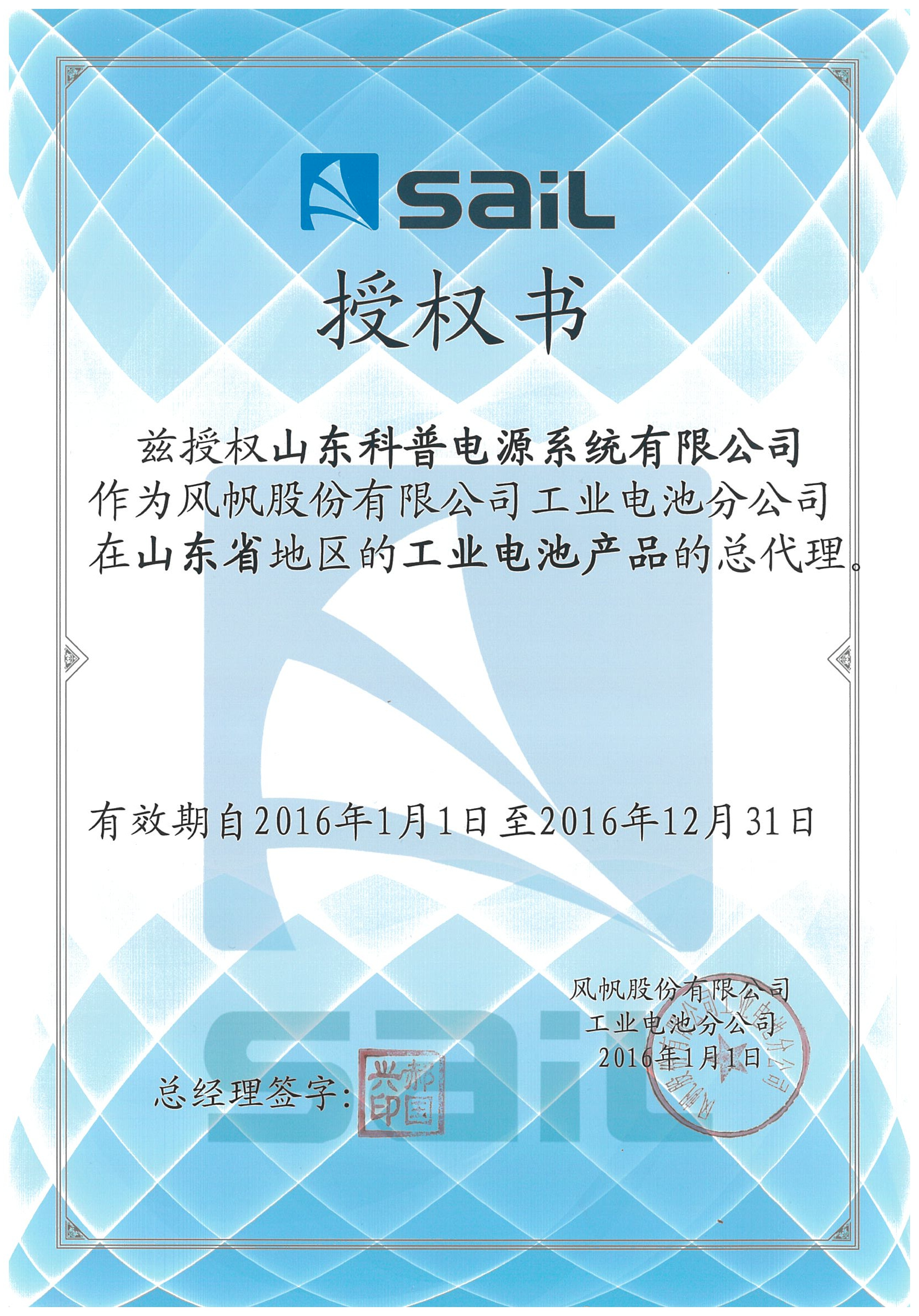 風(fēng)帆山東總代授權(quán)書